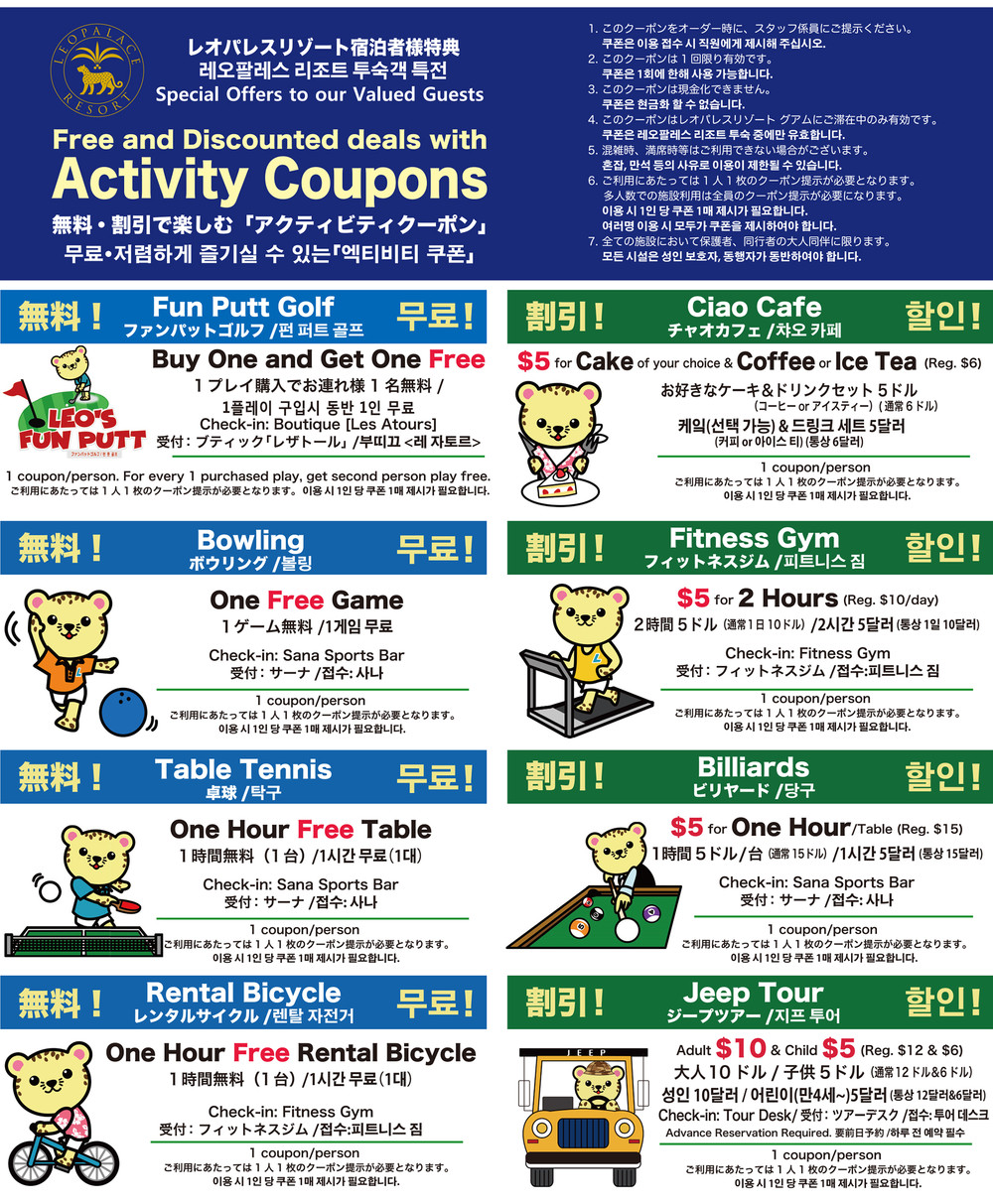 레오팔레스리조트 투숙고객에게 제공되는 리조트내 시설에 대한 무료/할인쿠폰입니다.