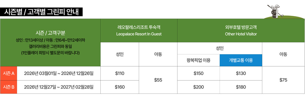 ※ 라커룸 및 샤워실 이용시 레오팔레스리조트 숙박객은 유료이용, 외부숙박객은 무료이용 / 라운딩전 칩핑, 퍼터 연습 이용 무료