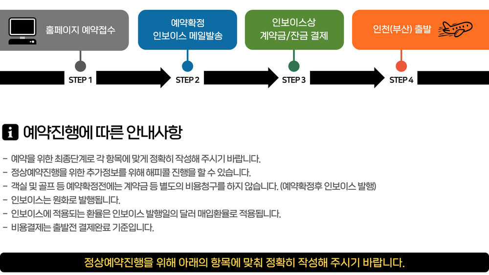 3. 인보이스를 참조하여 일정에 맞는 결제진행 바랍니다. (취소,환불 특약사항에 의거하여 계약금 미입금시 자동취소 될 수 있습니다.)